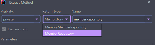 - new MemoryMemberRepository() → ์ด ๋ถ๋ถ์ ์ค๋ณต์ด ์ ๊ฑฐ๋จ