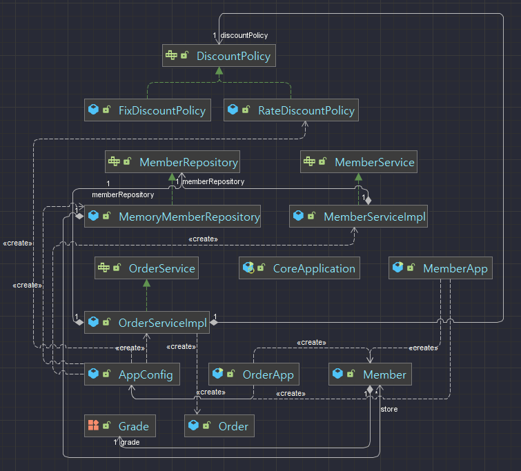 - ์ฃผ๋ฌธ ์๋น์ค ํด๋ผ์ด์ธํธ๊ฐ ์ธํฐํ์ด์ค์ธ DisCountPolicy๋ฟ๋ง ์๋๋ผ, ๊ตฌ์ฒด ํด๋์ค์ธ FixDisCountPolicy๋ ํจ๊ป ์์กด → DIP ์๋ฐ