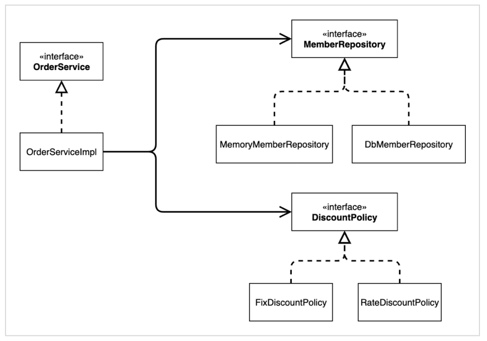 - OrderServiceImpl ์ DiscountPolicy ์ธํฐํ์ด์ค์ ์์กด → ์ค์ ์ด๋ค ๊ตฌํ์ฒด๊ฐ ์ฌ์ฉ๋ ์ง ๋ชจ๋ฆ